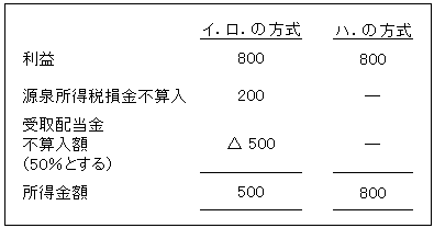 例えば、受取配当金1,000、源泉所得税200、差引利益800であった場合の所得金額はそれぞれ次のようになる。