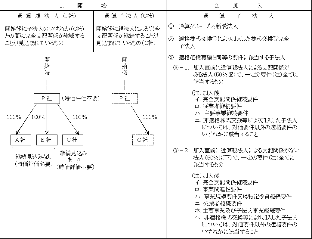 グループ通算制度開始時及び加入時における時価評価の対象とならない通算親法人及び通算子法人を対比すると次のようになっている(法64の11①、法64の12①)。