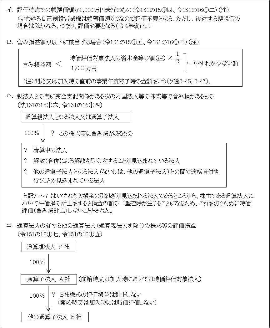 つまり、時価評価が必要な時価評価対象法人とは、通算親法人となる法人(開始の場合)及び通算子法人となる法人(開始又は加入の場合)のうち、時価評価の対象とならない法人を除くすべての法人で、時価評価の対象となる資産(時価評価資産)のうち時価評価資産から除外されない資産を保有するその法人である。